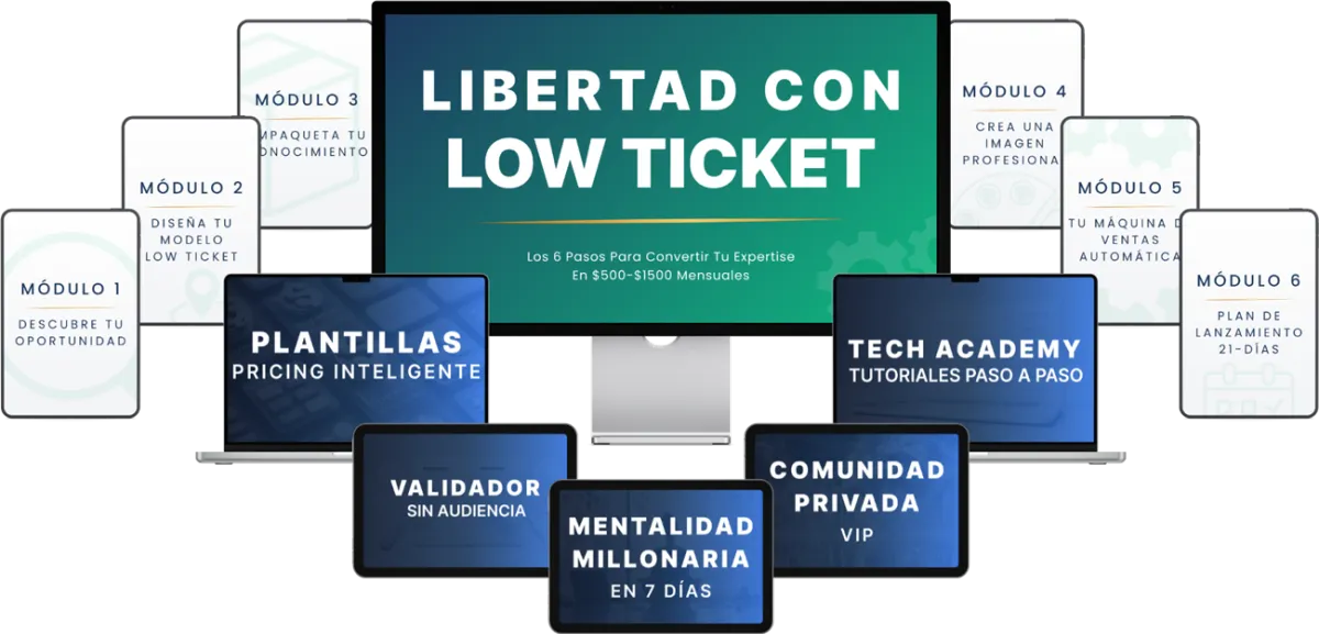 LIBERTAD CON LOW TICKET es un sistema completo de 6 módulos diseñado específicamente para profesionales con 8-15 años de experiencia que quieren monetizar su conocimiento. Recibes acceso inmediato al programa completo más 6 bonos valorados en $162 que te ayudan con mentalidad, validación, confianza, comunidad, tecnología y pricing. Todo está estructurado en módulos de 20-25 minutos que puedes consumir en tus horarios nocturnos disponibles. No hay contenido bloqueado, lo recibes todo desde el día 1.